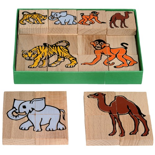 In this wooden puzzle there are four playfully illustrated pictures to assemble: an elephant, tiger, camel, and a monkey. Additionaly, the packaging contains miniatures of these pictures that serve as a helpful hint!