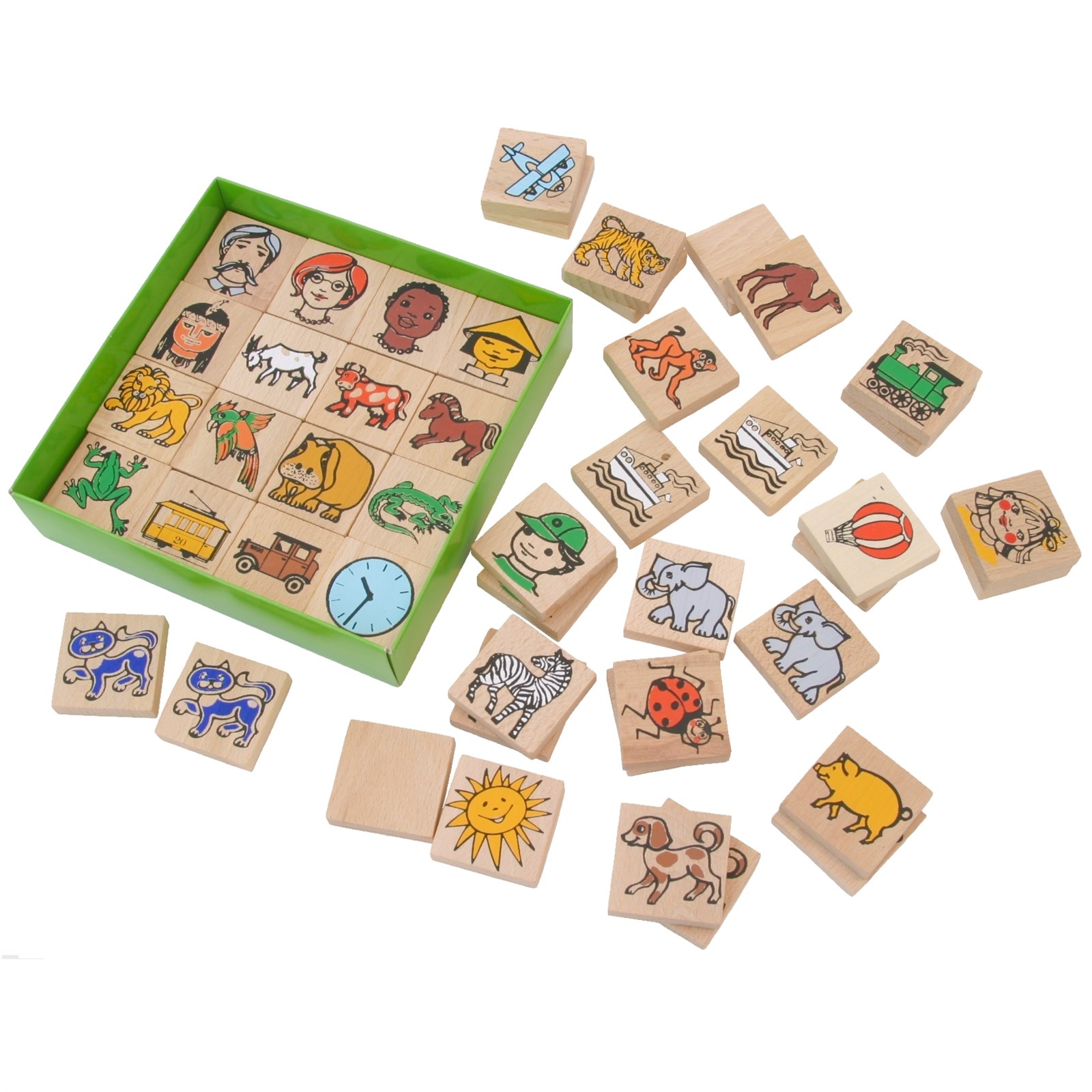 Populární rodinná hra na procvičení paměti v dřevěném velmi trvanlivém provedení o 64 herních kamenech (32 dvojic obrázků).